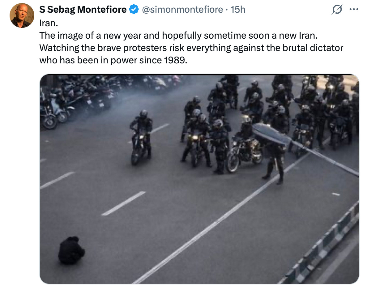 As the year closes, all but one deceased hostage have been returned to Israel, and not just the hostages in Gaza, but Elizabeth Tsurkov who was held in Iraq, and whose sister Emma - a dear friend - fought for more than two years for her return. As for peace in the region… the war in Gaza has minimized, and the people of Iran are in the third day of attempting to overthrow their tyrannical regime - the result of which would be the greatest move towards peace in the Middle East in our lifetimes. Does the Western media care? Of course not. They are an ally to the forces that declared war on the West and who have successfully globalized the Intifada, and created a permanent hunting season on Jews, Christians and anyone upholding our values.