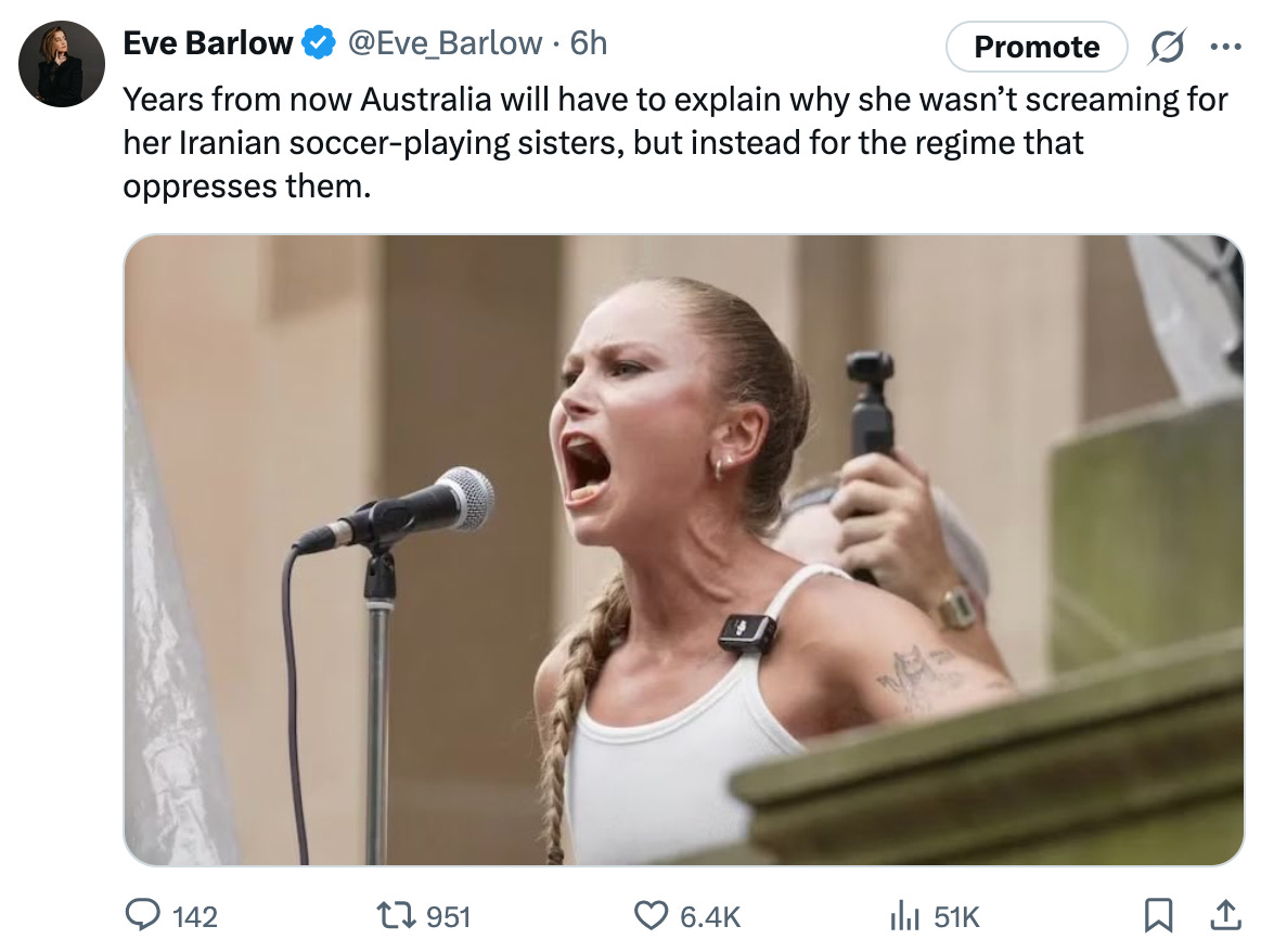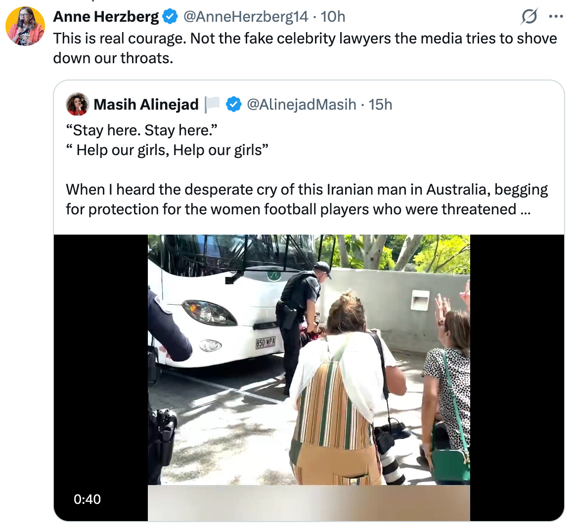 In my piece yesterday, I reported on the story of the brave Iranian women’s soccer team, and their threatening situation facing their departure from Australia, where they’ve been competing. Today that story met a devastating conclusion. Right now, I am holding out for a different ending. Reports are mismatched. There is a degree of misinformation around. Yet suffice to say, if all the players were indeed offered asylum by Albanese’s government, the majority of the Iranian team were unable to accept the offer. If you understand anything about abuse and coercive control, you will be highly skeptical that the vast majority of these female players had the means to access the offers of asylum.