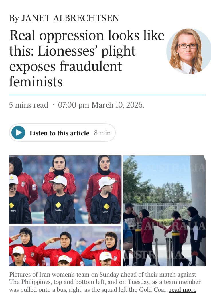 Any Australian feminist who tries to play down what is happening with the Iranian soccer players is not a feminist but a narcissistic opportunist. They have signaled SOS on their way to the airport. Only a few of these women escaped. Yes some of them had concern for their families back home but if they were glad to be forcibly taken back on a plane by their regime guard male minders then why were they making distress signals from the windows?