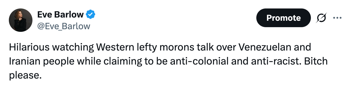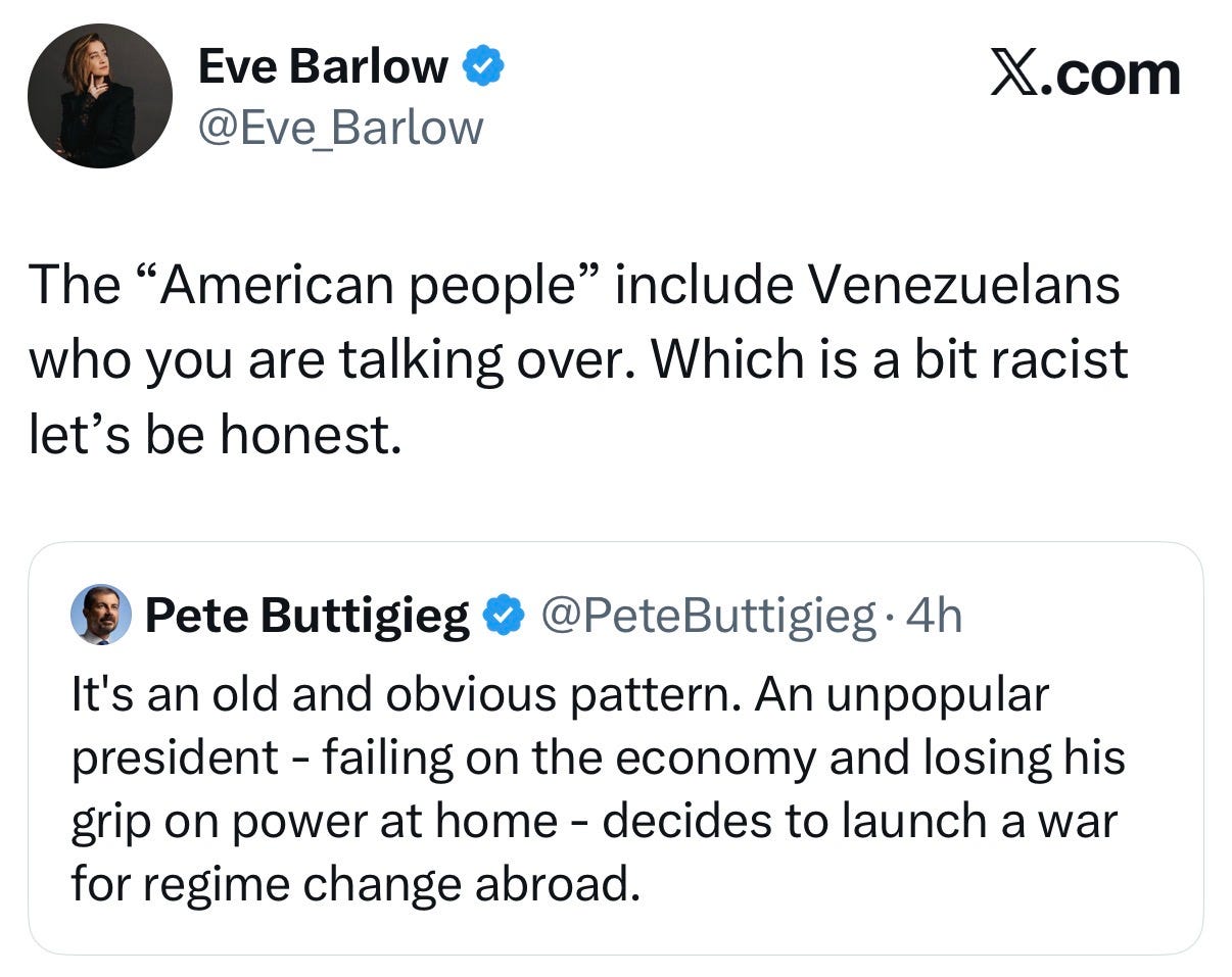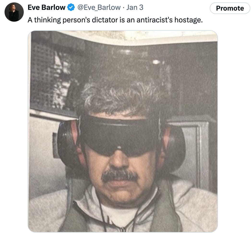 Briefed! Habibi, the New Yorker Venezuleans are ecstatic. Get off BlueSky and borrow a Zionist’s phone for a moment, and you will see dozens of mind-blowing videos. Defending dictatorships on day three in the job? Who is doing the briefing? The ghost of Benito Mussolini?