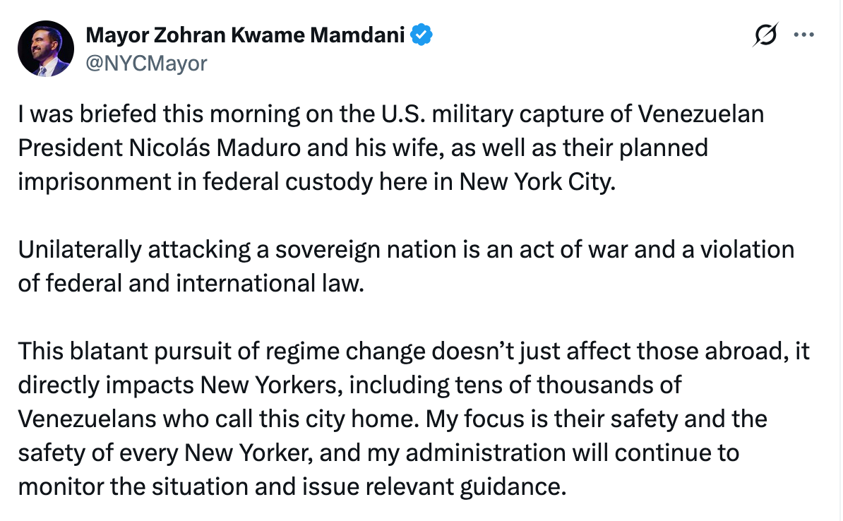 Meanwhile, it’s hard to know for sure whether these are authentic accounts, but my DMs are personally flooded with Iranians and Venezuelans leaping for joy and expressing gratitude for real representation in an otherwise totally upside-down media. Mayor Mamdani, predictably, stuck by his comrade. The 34-year-old is so serious now and has learned new words.