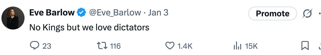 Maduro’s capture and the rise of the Iranian people are feats of rugged individualism. I too am a rugged individual. It protects everything I am a fan of. Freedom of thought, religion and expression. Art, music and film. Poetry and writing, obviously. The pursuit of genuine genius. Democracy! The only people who protest to protect the “warmth of collectivism” are talentless sourpusses who want to drag everyone down to hell with them. The rest of us have too much fun using our own brains.