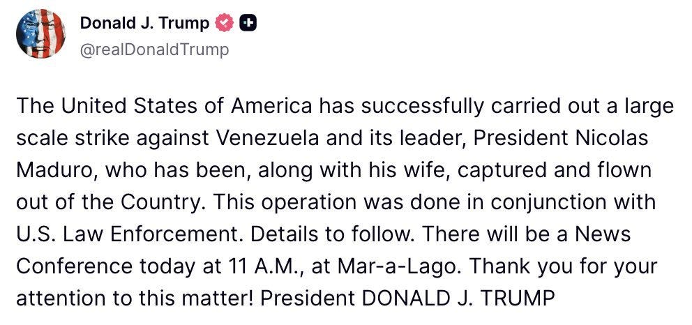 These hideous geeks. These crippled werewolves. More of us normies can see it now; leftism is a form of collective mental illness. They would spend hours trying to convince you that a broccoli was a cauliflower. Just imagine. A world where there are no more dictators. Isn’t that what the leftists want? “No Kings!” they insisted, just days after Israel together with Trump’s administration liberated the remaining hostages of Gaza and achieved a ceasefire in Gaza. No Kings, they said. What they meant was - Our Kings! Venezuela’s own Pharaoh - Nicolás Maduro - is their latest saint. They learned that he existed on Saturday when Trump posted this: