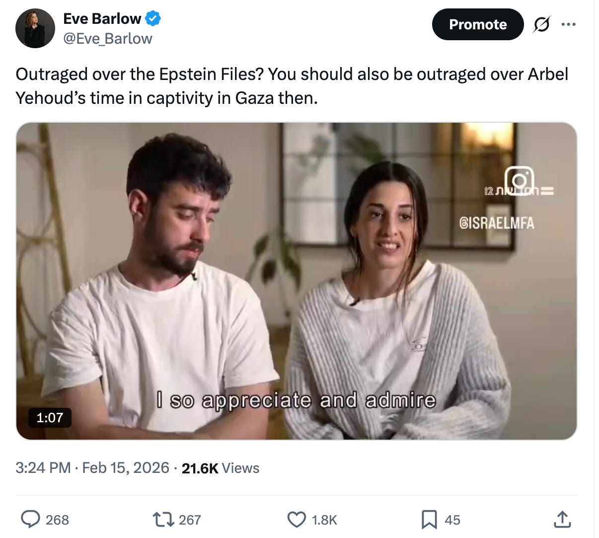 Feminists who didn't once advocate for the freedom of the Israeli hostages, including Arbel, are – via the complicity of their silence – assailants of her sexual abuse in captivity. Every single Western "feminist" who denied and diminished the women in Hamas captivity are devoid of any credibility, whether journalist, lawyer or politician. Let the testimony of Arbel Yahoud remind you: they're not "human rights lawyers” etc. They are "me me me” professionals, who selectively exploit victims they deem to be politically correct or perfect for their own gain. They do not care about women who are abused. They see the abuse and they decide to take advantage. It’s predatory.
