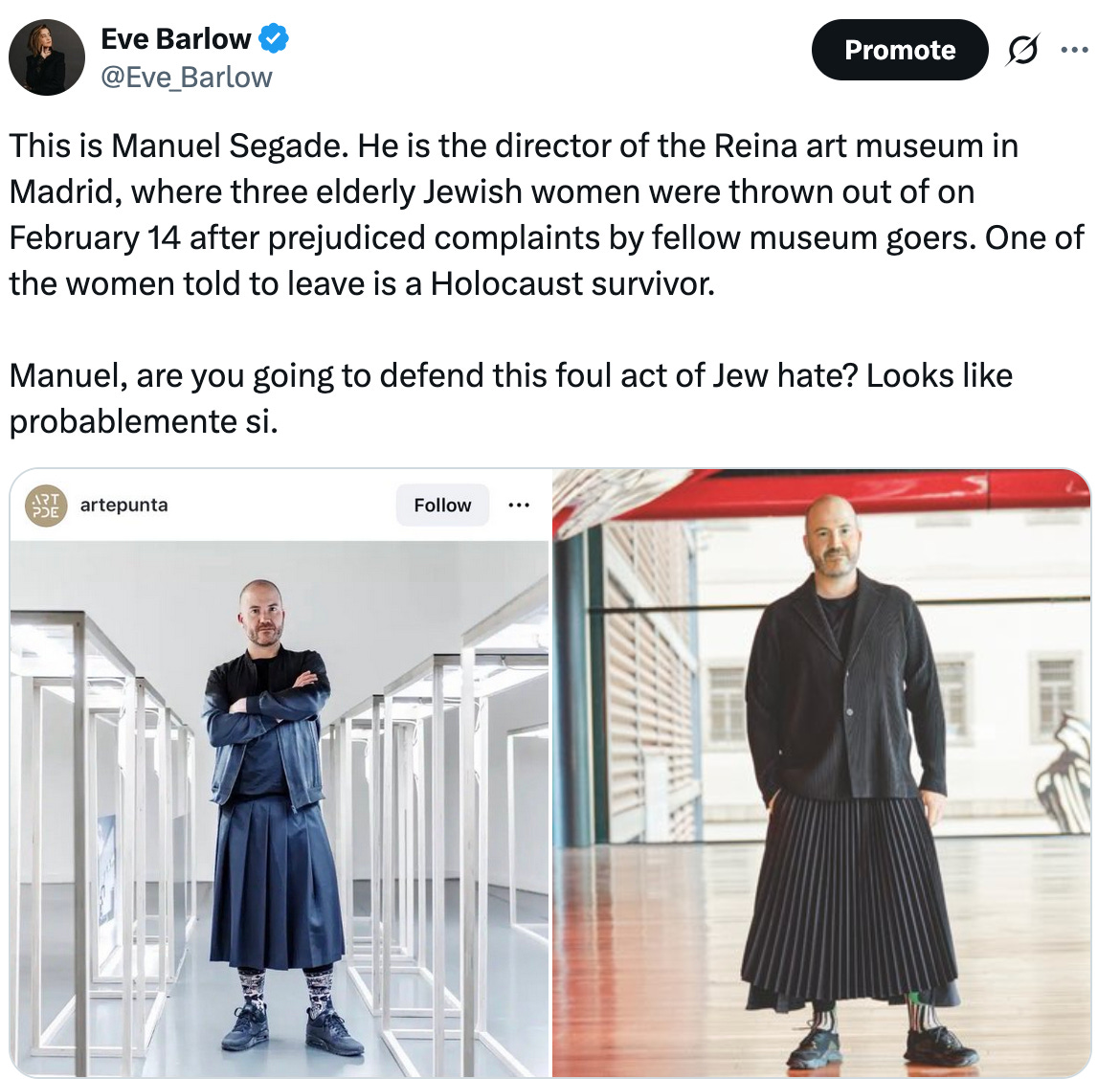Denying people access to art is evil. Denying people their creative voice is evil. I would like to know the profiles of everyone who complained about the three Jewish women at the art museum in Madrid on Saturday. Gender, age, religion, etc. Why don't we know? We should know.
