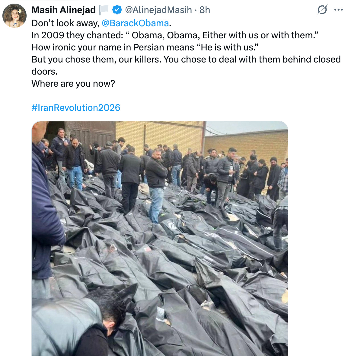 Yes, this did begin with the appeasement of Barack Obama. Were he not to enter a nuclear deal with Iran and instead supported the then uprising, we would arguably not be here now. This precedent of appeasement towards the Iranian regime from leaders around the world has kept Iranian civilians in this Islamist cage, where they can’t dance, they can’t sing, the women can’t show their hair, without risk of death. Appeasement can get fucked. If you’re reading this now, make demands of your politicians, at every level. A terrorist regime has taken 90 million Iranians ransom to blackmail the world. Now Iranians fight with empty hands. They are without food, without water. IRGC police are raiding house after house, searching for Starlink satellites, and connective devices, securing total blackout.