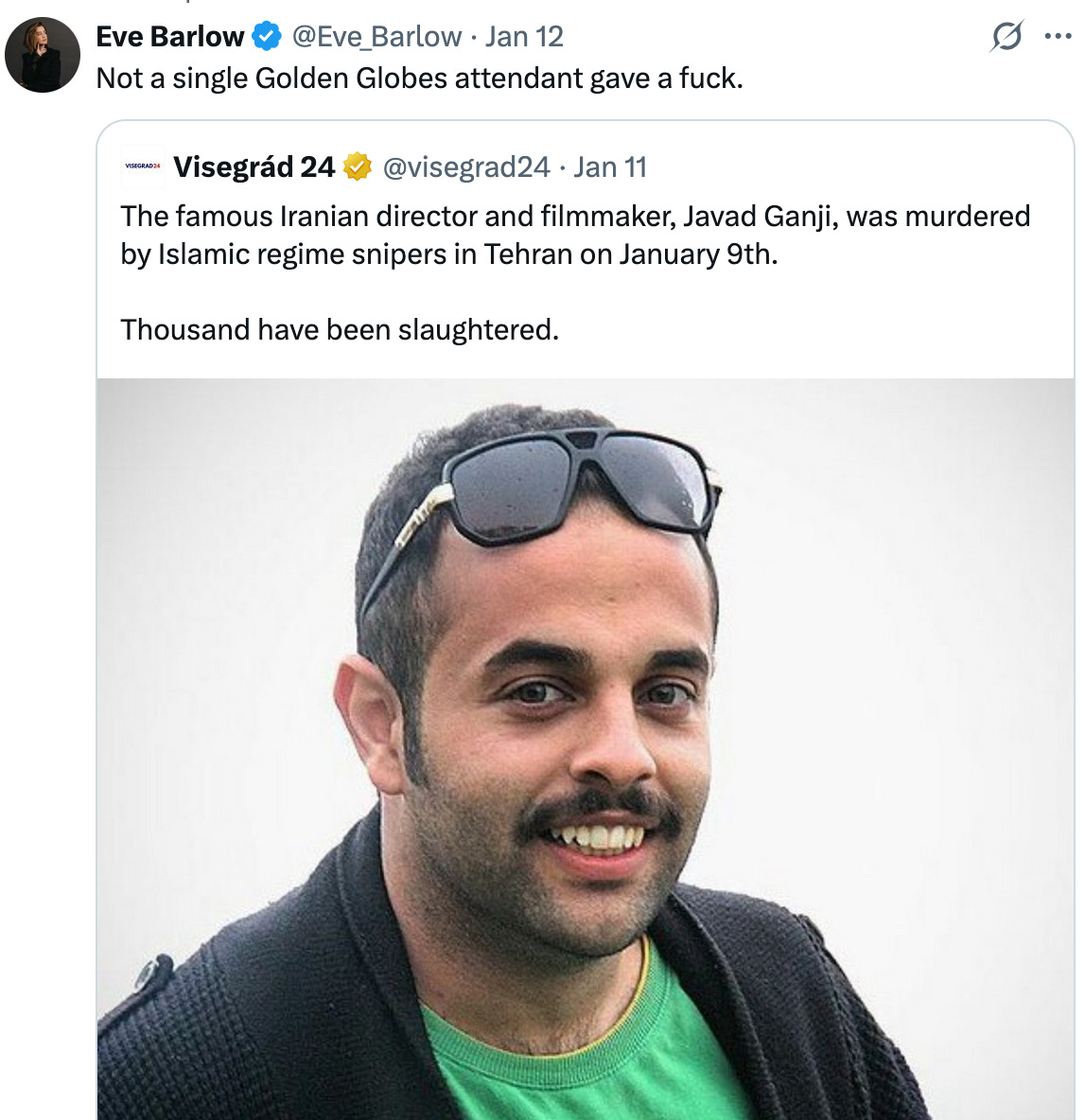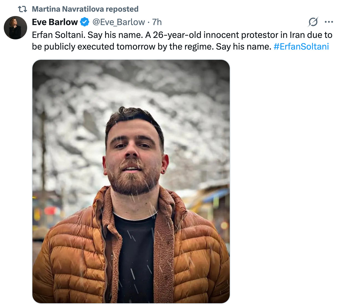 Yesterday I wrote about Erfan Soltani - the young 26-year-old man who is going to be publicly executed in less than 24 hours. Today’s task was to make his name trend; to make him famous. Since 6AM, all of us with sizeable Instagram accounts have been hash-tagging his name. Past practice shows this makes the regime less likely to execute. Is this what our world has come to? Years ago, during the BLM movement, leftists screamed at us to “say their names!” – about the dead. Black and brown people who were already dead in police custody. “sAy tHeiR nAmEs!!!!” Today we asked them to say a living man’s name, who is on death row. A simple act that could be the difference between life and death for him. They could not be bothered.