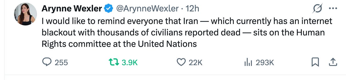You know, I think we Jews have come to expect the Left to treat us with utter revulsion and condemnation, but watching the “community of the good” just let Iranians be gunned down to death in the thousands because they can’t get it up for a nation of freedom-fighters prepared to die for liberation is making my head hurt. I knew the hobbyist morality police were un-serious people, reducing nobility to a bunch of pin badges on their backpacks and slogans in their social media bios. But their lack of care about anything that can’t be tokenized is becoming sociopathic. If only we could trade them all in for the brave men and women of Iran.