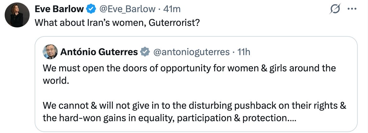 Tony Guterrorist is tweeting today about giving women and girls opportunities. He has not spoken about the Iranian uprising. All of you Westerners who follow him on Instagram, who still believe that the UN is the word of God, are you not embarrassed? Are you not angry? You should be furious.