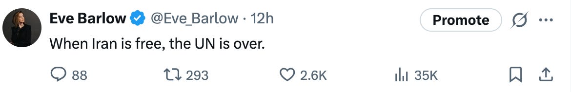 My readers, we are going to have to sit tight and have faith that the response is coming and that it will devastate the regime, because I don’t believe there is any other conclusion to the bravest uprising of a people in our lifetimes. Long live the people of Iran. The pro-Islamist “anti-imperialist” clowns of the West can cry a river about it. It is not for us on social media to take bets on complex military operations. Whatever happened in the skies over the Middle East on Wednesday night is for eyes only to know, and the rest of us to wait and find out. Just hold fast, and be the optimistic energy that the warriors of Iran need right now. Netanyahu’s life mission is to topple this regime, and Trump is all in favor. That’s as much as we know.